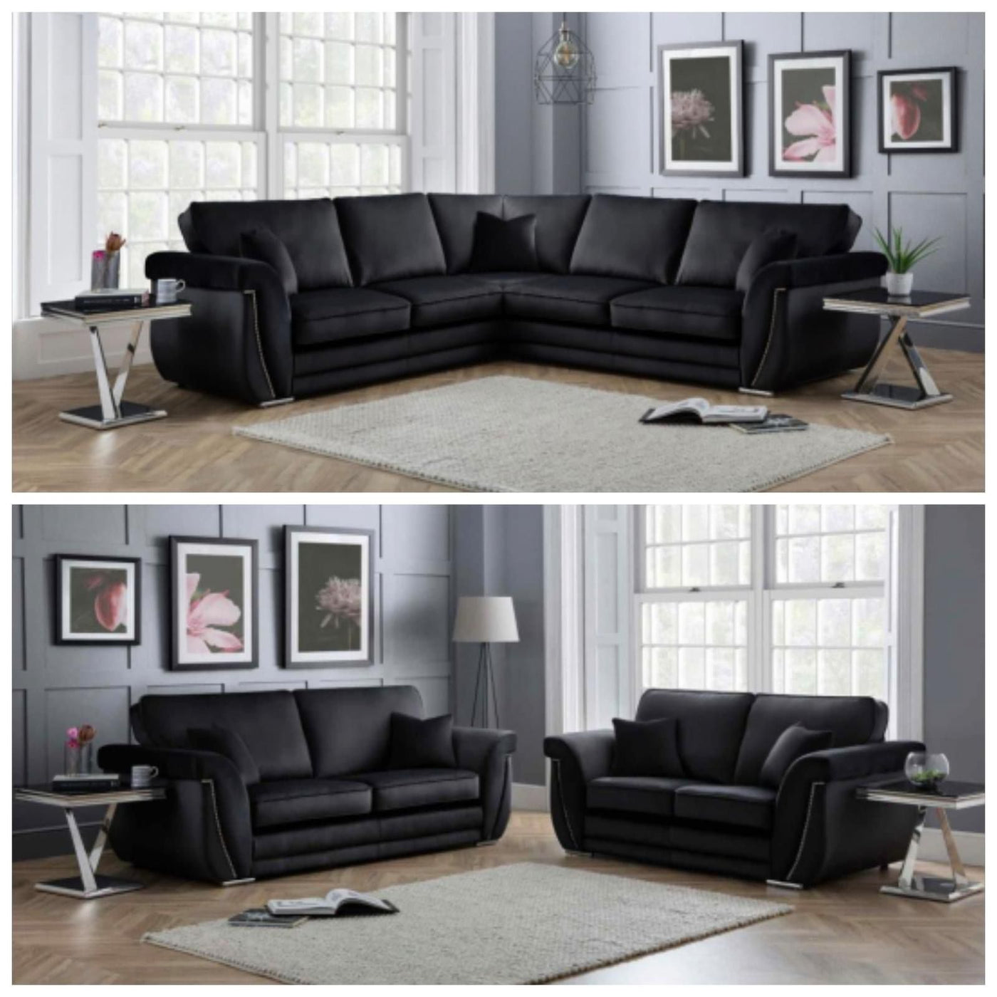 New Luxe Plush Velvet Black With High Back Cushions Couch 3+2 Seater Sofa Set