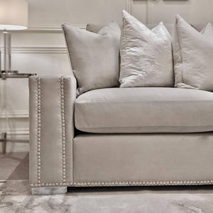We provide this sofa in a beautiful charcoal plush grey fabric, contrasted by the silver-toned studs which give the sofa a beautifully traditional plush-style twist. The chesterfield arm design has been decorated with tufts to give you eye-catching attention to the detailing. Ray Furniture have specifically focused on comfort to accompany the intricate design. Comes with fibre-filled back cushions and foam-filled seating cushions to keep you cosy while maintaining the highly luxurious style.