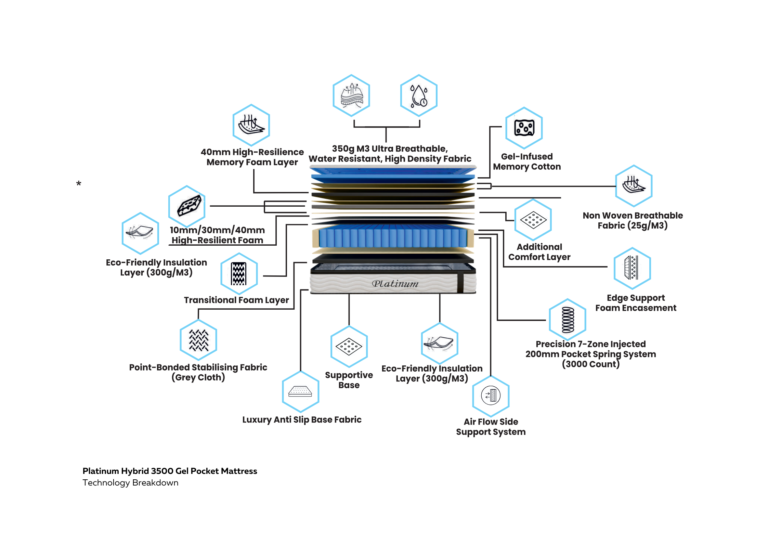 1. Advanced Gel Pocket Technology The Platinum Mattress features an upgraded 3500 pocket gel system, providing exceptional targeted support and pressure relief. Each gel pocket functions independently to adapt to your body’s unique contours, reducing pressure points and enhancing overall comfort. This advanced technology also minimises motion transfer, making it perfect for couples who share a bed.